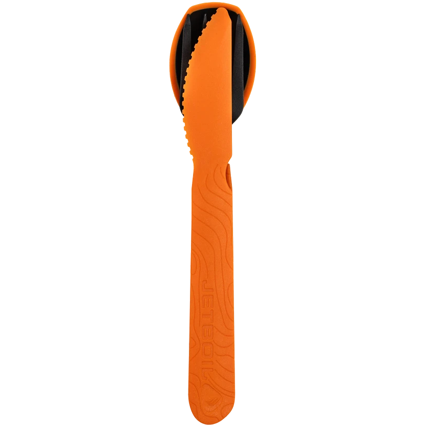 The perfect outdoor utensil set. Forget about the mess and hassle of cleaning on the trail. The Jetboil TrailWare is designed to easily extend and reach inside a Jetboil cookpot or dehydrated meal package. The unique silicone edge spoon will easily scrape every morsel while minimizing scratches to the pot surface. All three utensils snap together for easy storage and transport.